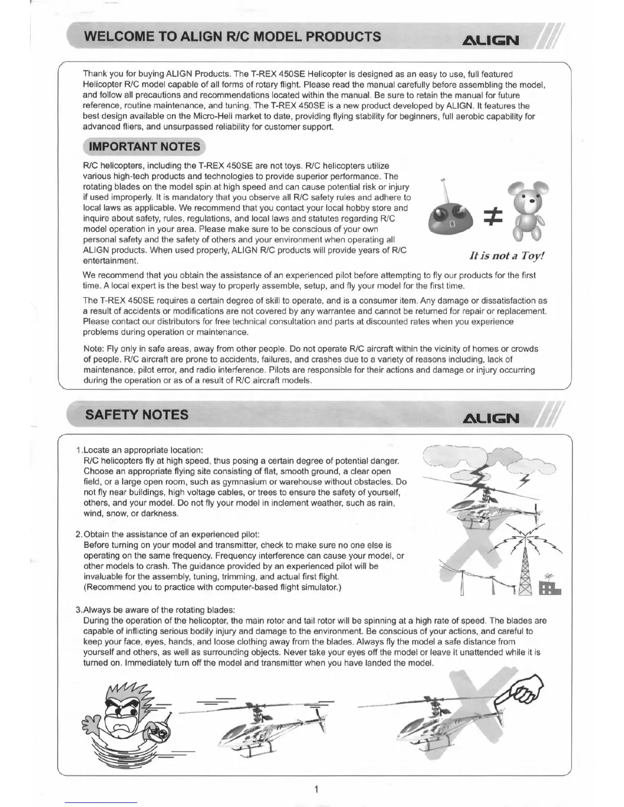 Align T-Rex 450 SE - WELCOME TO ALIGN R;C MODEL PRODUCTS; IMPORTANT NOTES; SAFETY NOTES
