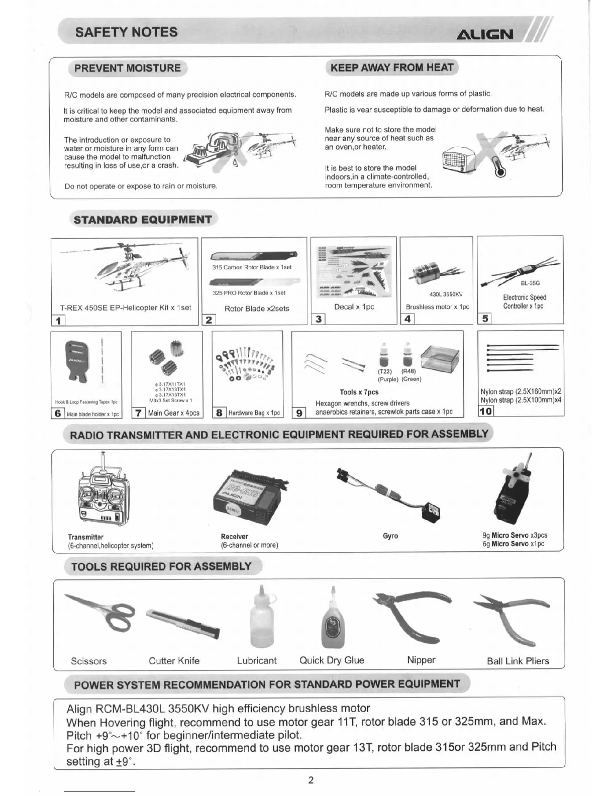 Align T-Rex 450 SE - SAFETY NOTES; PREVENT MOISTURE; KEEP AWAY FROM HEAT; STANDARD EQUIPMENT