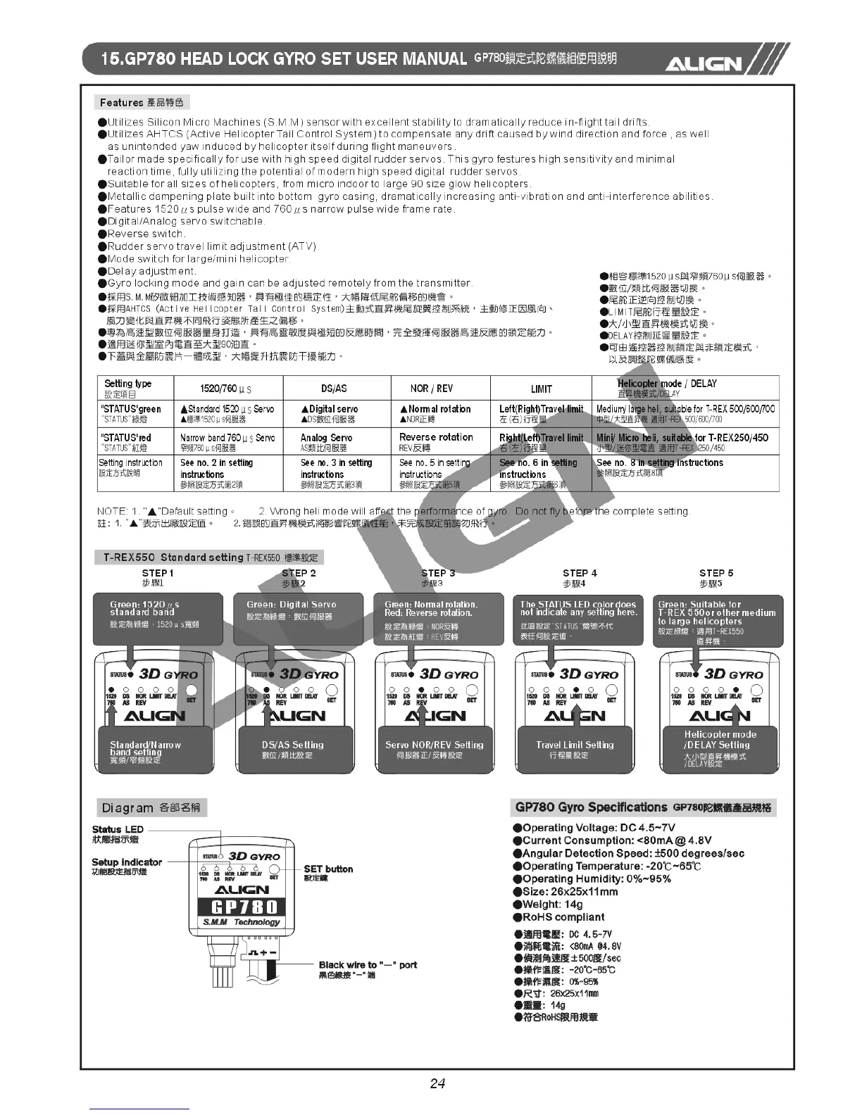 Align T-REX 550E - Gyro System Manual; GP780 Head Lock Gyro Setup