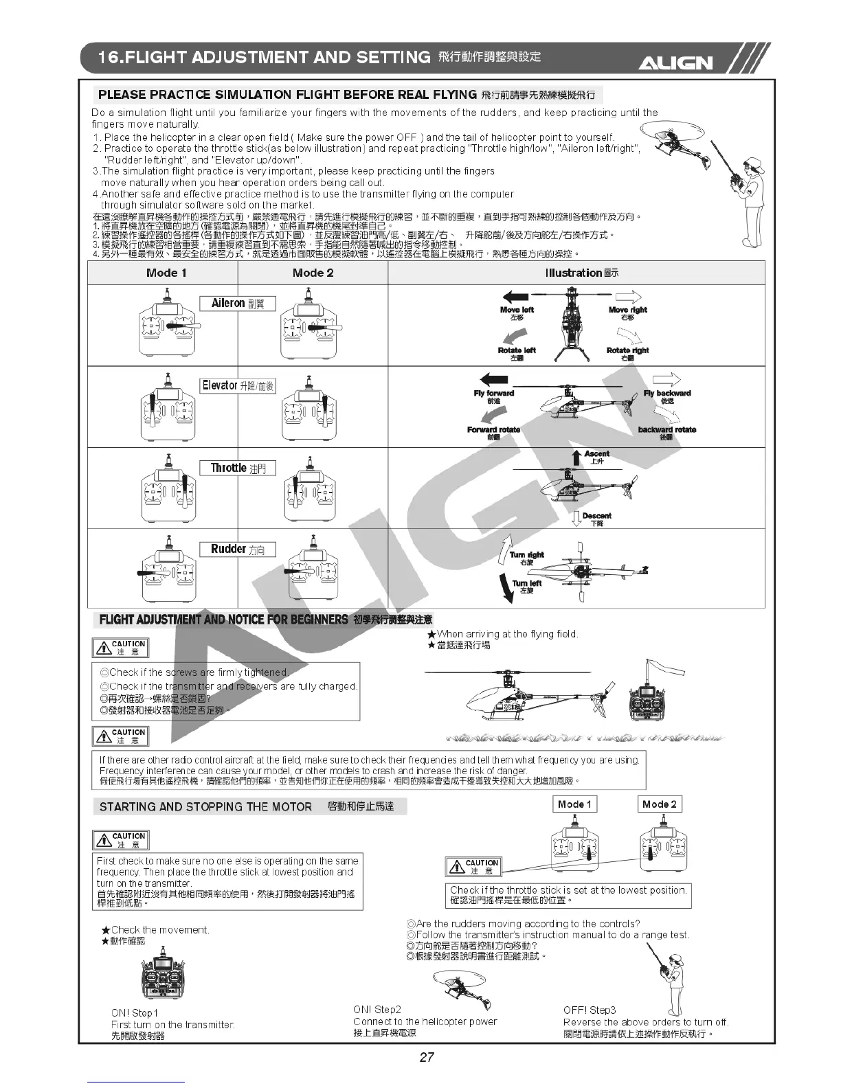 Align T-REX 550E - Flight Operation and Adjustments; Practice Simulation Flight; Beginner Flight Adjustments; Motor Starting and Stopping