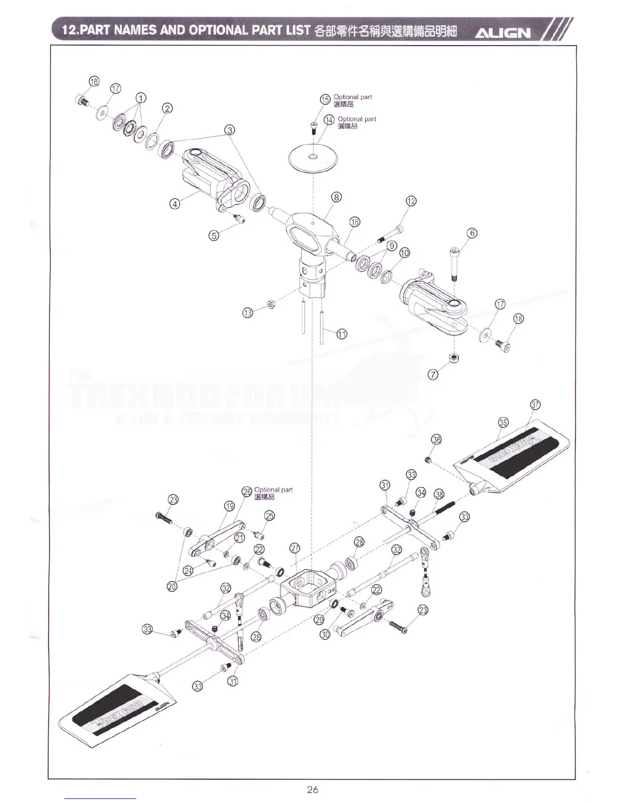 Align T-REX 600 CF - Part Names and Optional Part List; Component Identification and Parts List