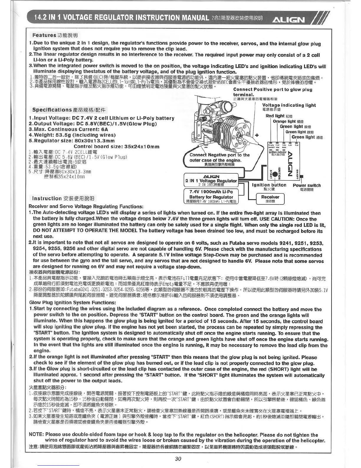 1.Due to the unique 2 in 1 design, the regulator's functions provide power to the receiver, servos, and the internal glow plug