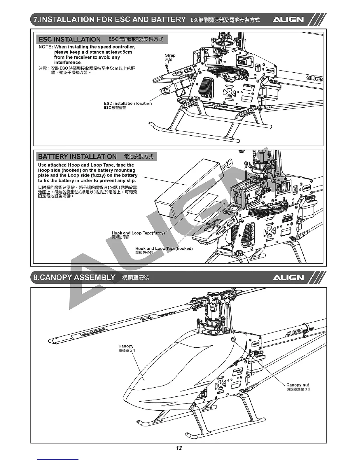Align Trex 450 Plus - Installation for ESC and Battery; Canopy Assembly