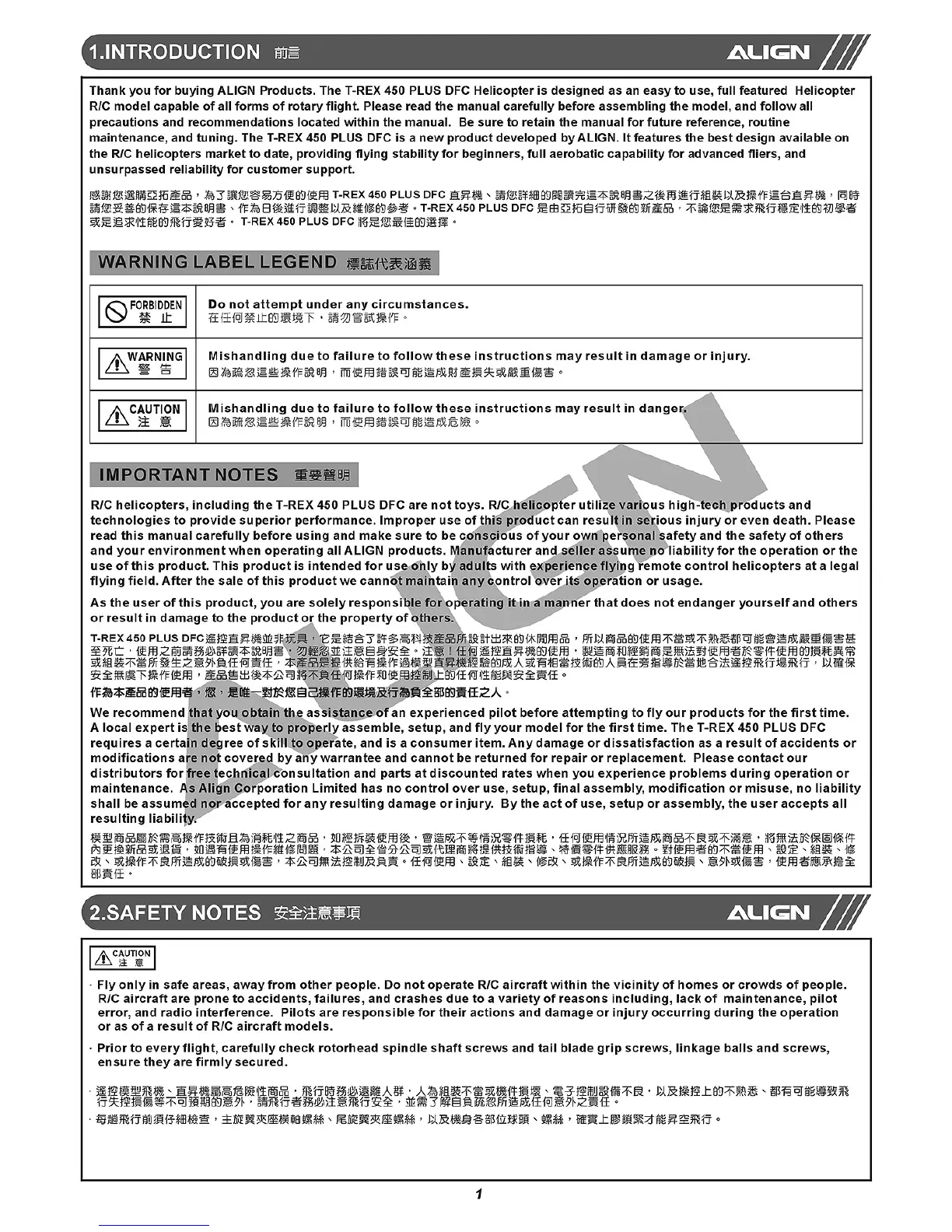 Align Trex 450 Plus - Introduction to the T-REX 450 PLUS DFC; Warning Label Legend; Important Notes