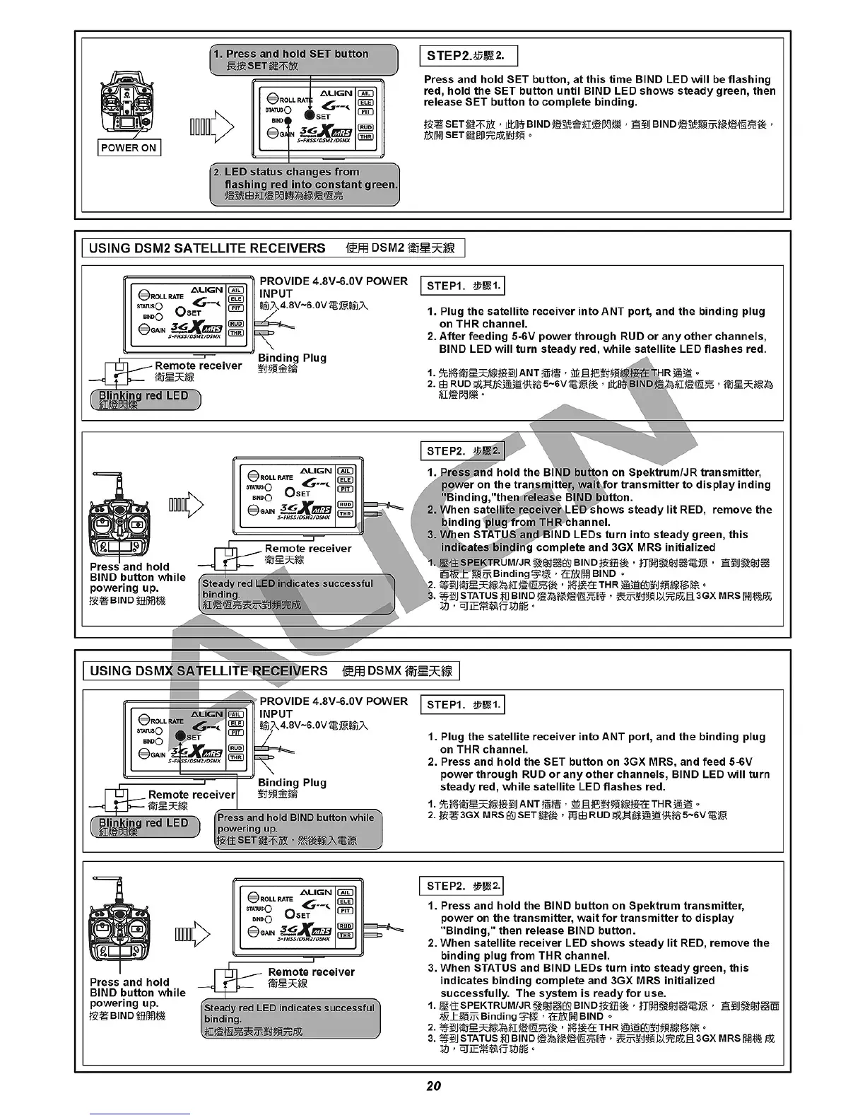 Align Trex 450 Plus - Using DSM2 Satellite Receivers; Using DSMX Satellite Receivers