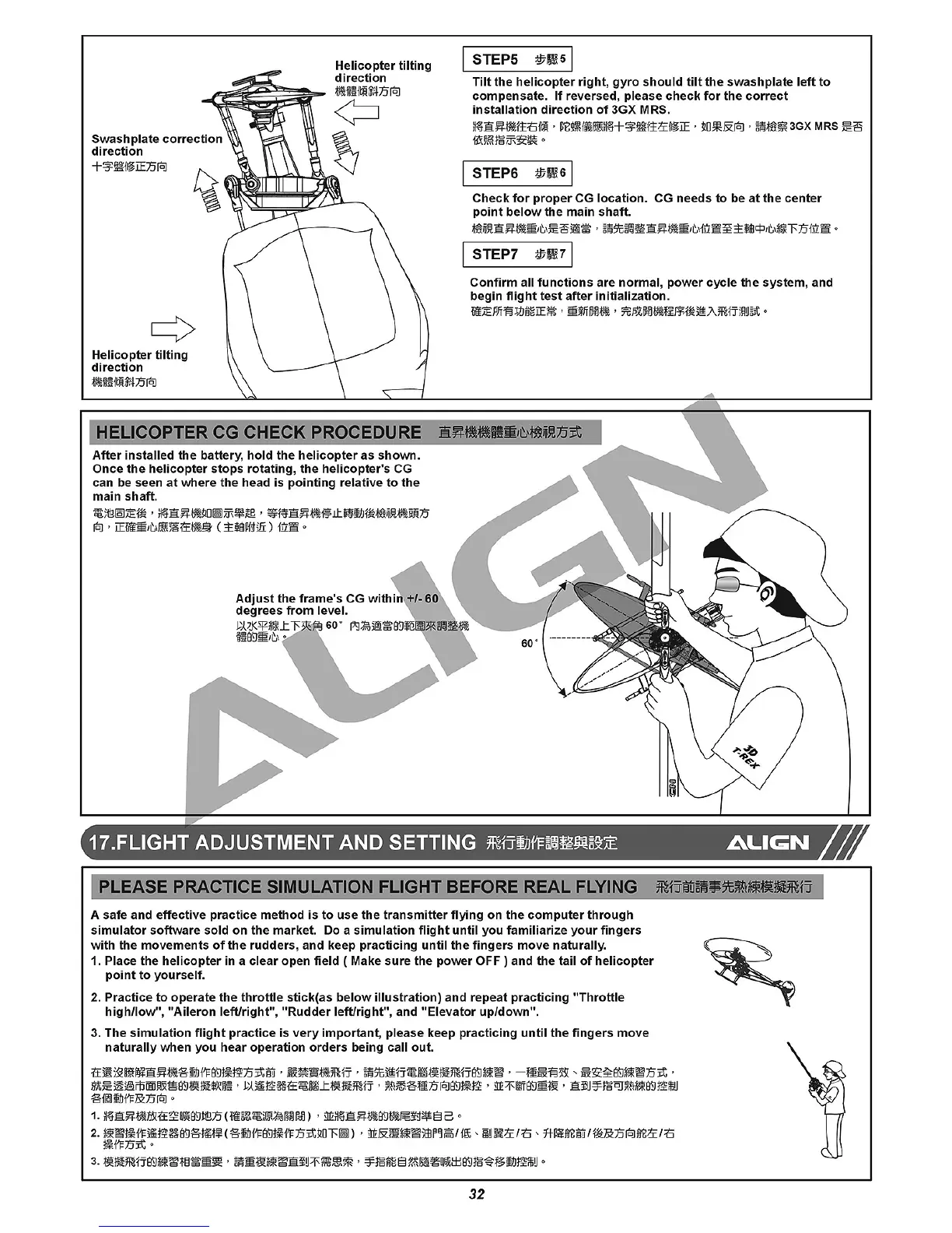 Align Trex 450 Plus - Flight Adjustment and Setting; Simulation Flight Practice; Helicopter CG Check Procedure; Flight Control Practice Steps