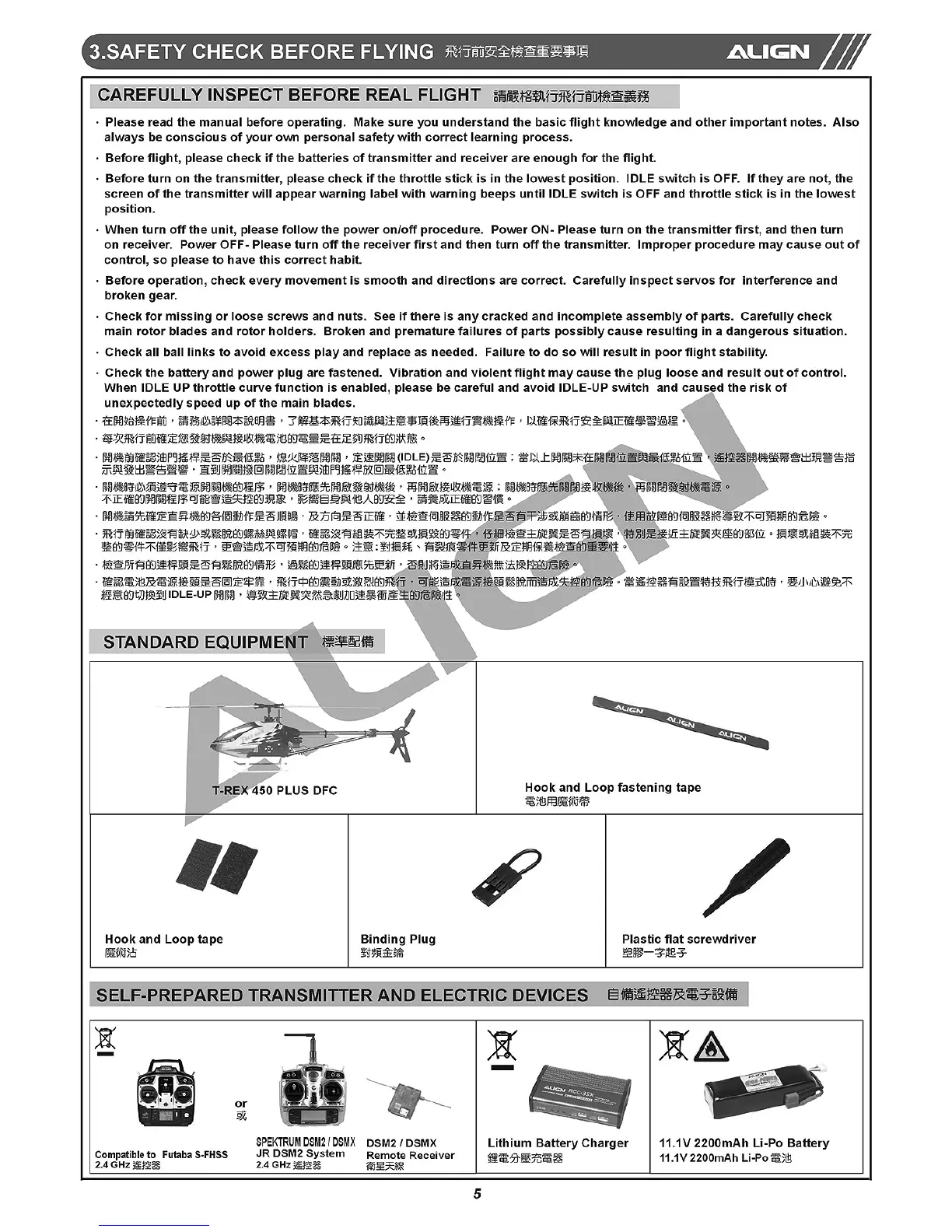 Align Trex 450 Plus - Safety Check Before Flying; Pre-Flight Inspection Procedures; Standard Equipment and Transmitter Setup