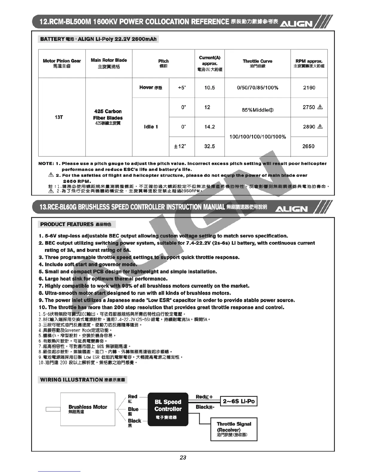 Align Trex 500ESP - POWER COLLOCATION REFERENCE; BATTERY SPECIFICATIONS; BRUSHLESS SPEED CONTROLLER INSTRUCTION MANUAL; PRODUCT FEATURES