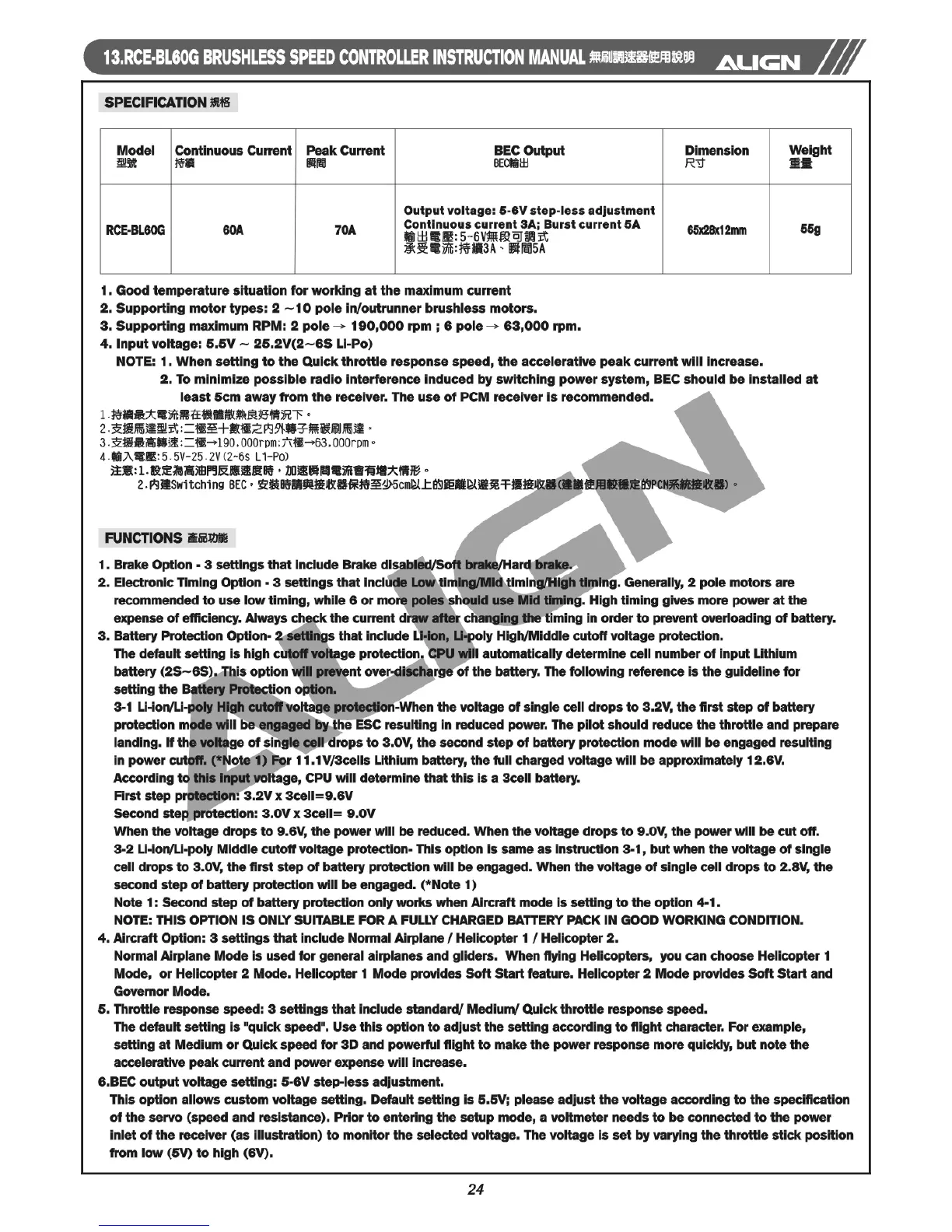 Align Trex 500ESP - ESC SPECIFICATIONS; ESC FUNCTIONS