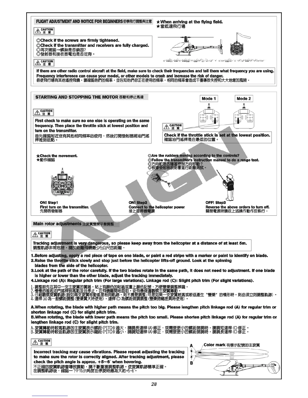 Align Trex 500ESP - FLIGHT ADJUSTMENT AND NOTICE FOR BEGINNERS; MOTOR STARTING AND STOPPING; MAIN ROTOR ADJUSTMENTS