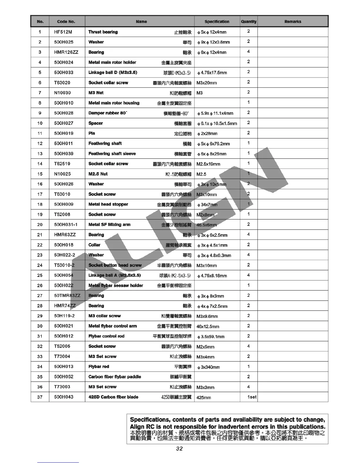 Align Trex 500ESP - PART NAMES AND OPTIONAL PART LIST; PARTS LIST AND SPECIFICATIONS