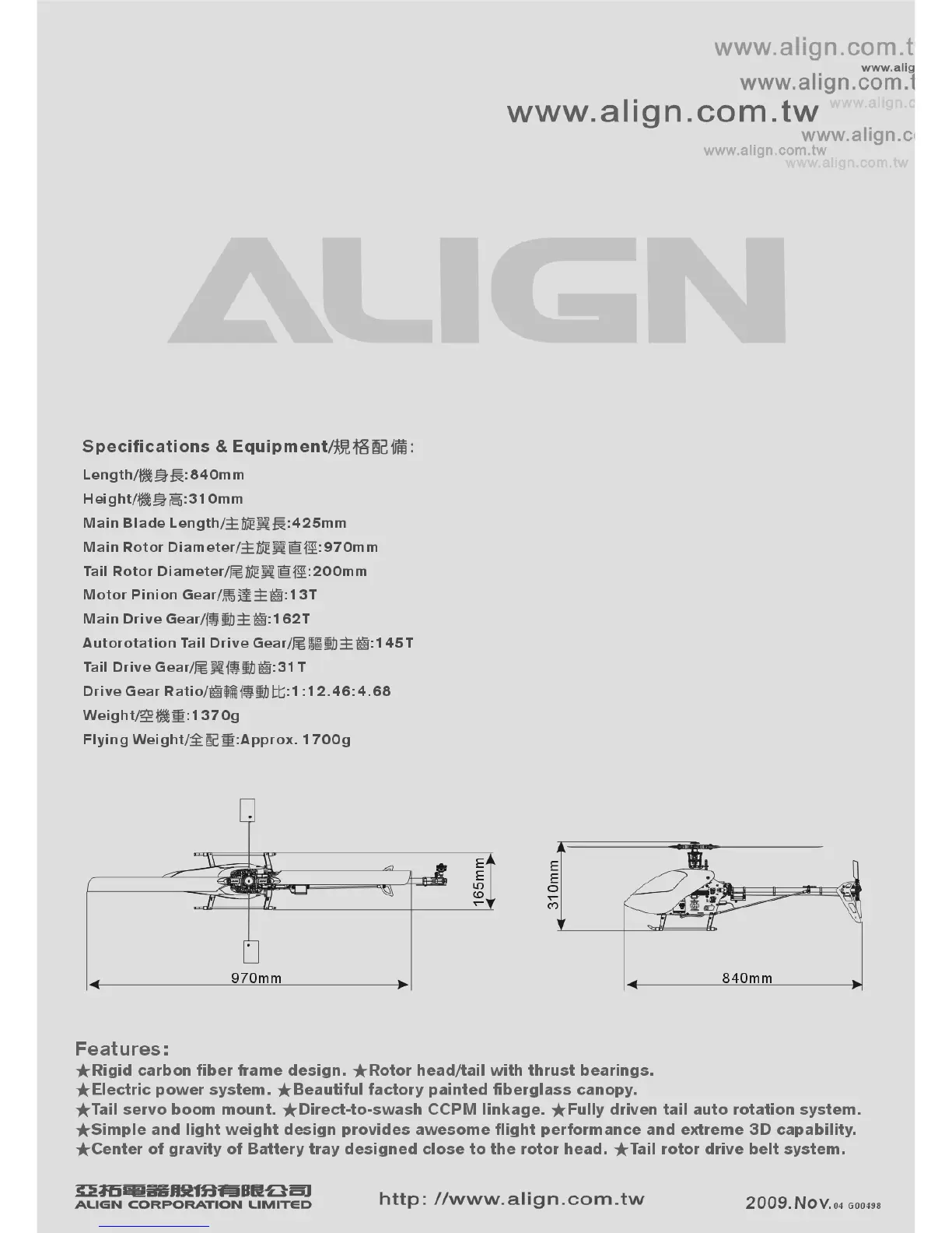 Align Trex 500ESP - SPECIFICATIONS AND EQUIPMENT; FEATURES
