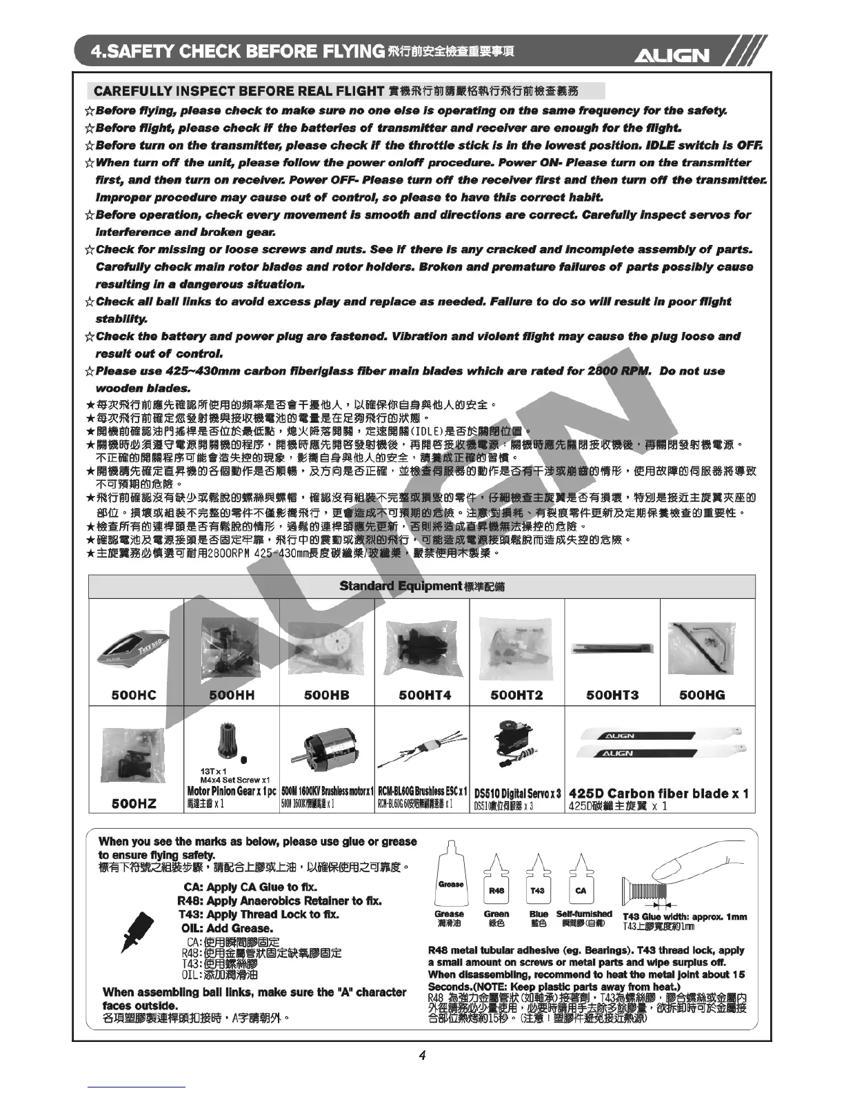 Align Trex 500ESP - SAFETY CHECK BEFORE FLYING; PRE-FLIGHT INSPECTION CHECKLIST
