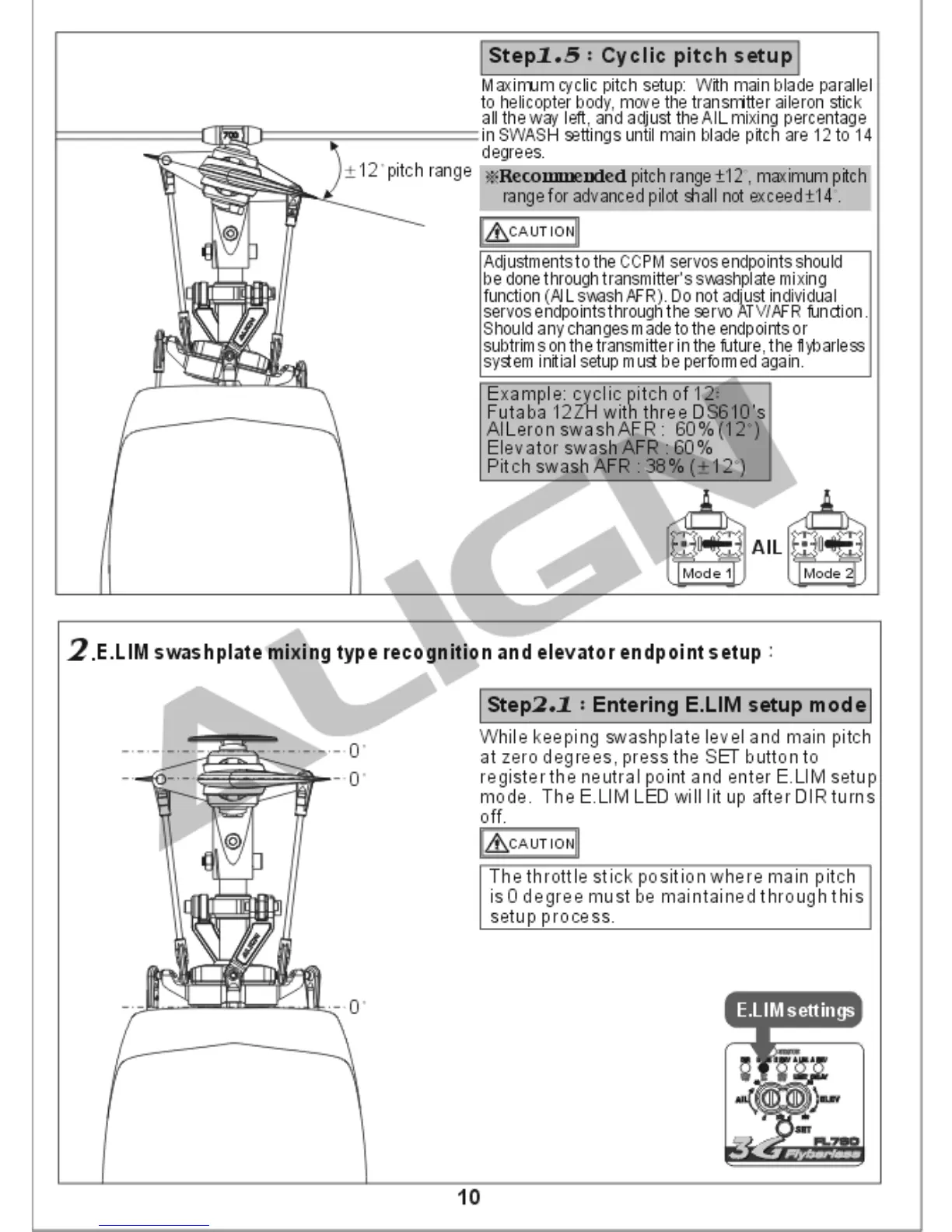 Align TREX 700 - DIR Mode: Mechanical Travel and Neutral Setup; Cyclic Pitch Setup Procedure; E.LIM Setup Mode Entry