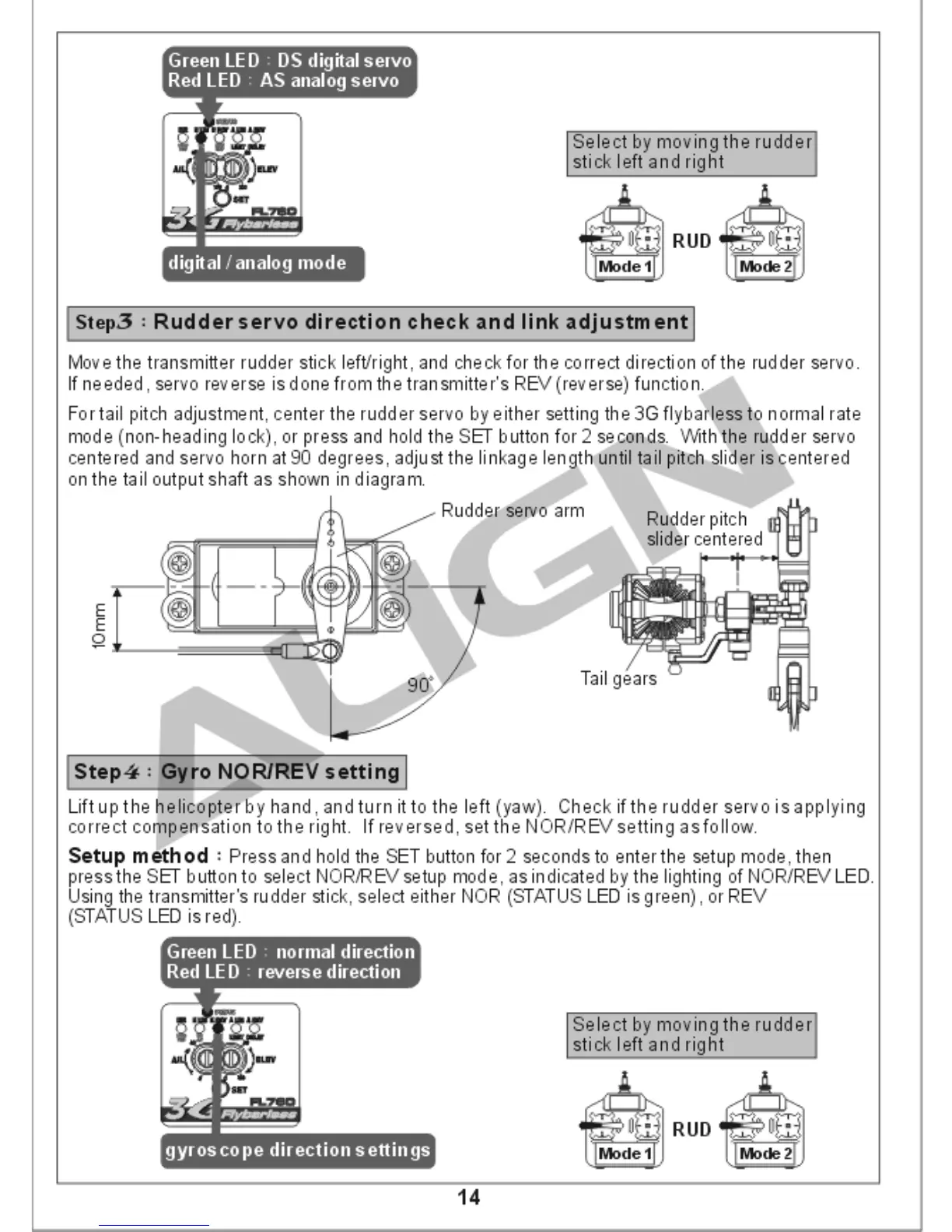 Align TREX 700 - Rudder Servo Direction and Linkage Adjustment; Gyro Normal;Reverse (NOR;REV) Setting
