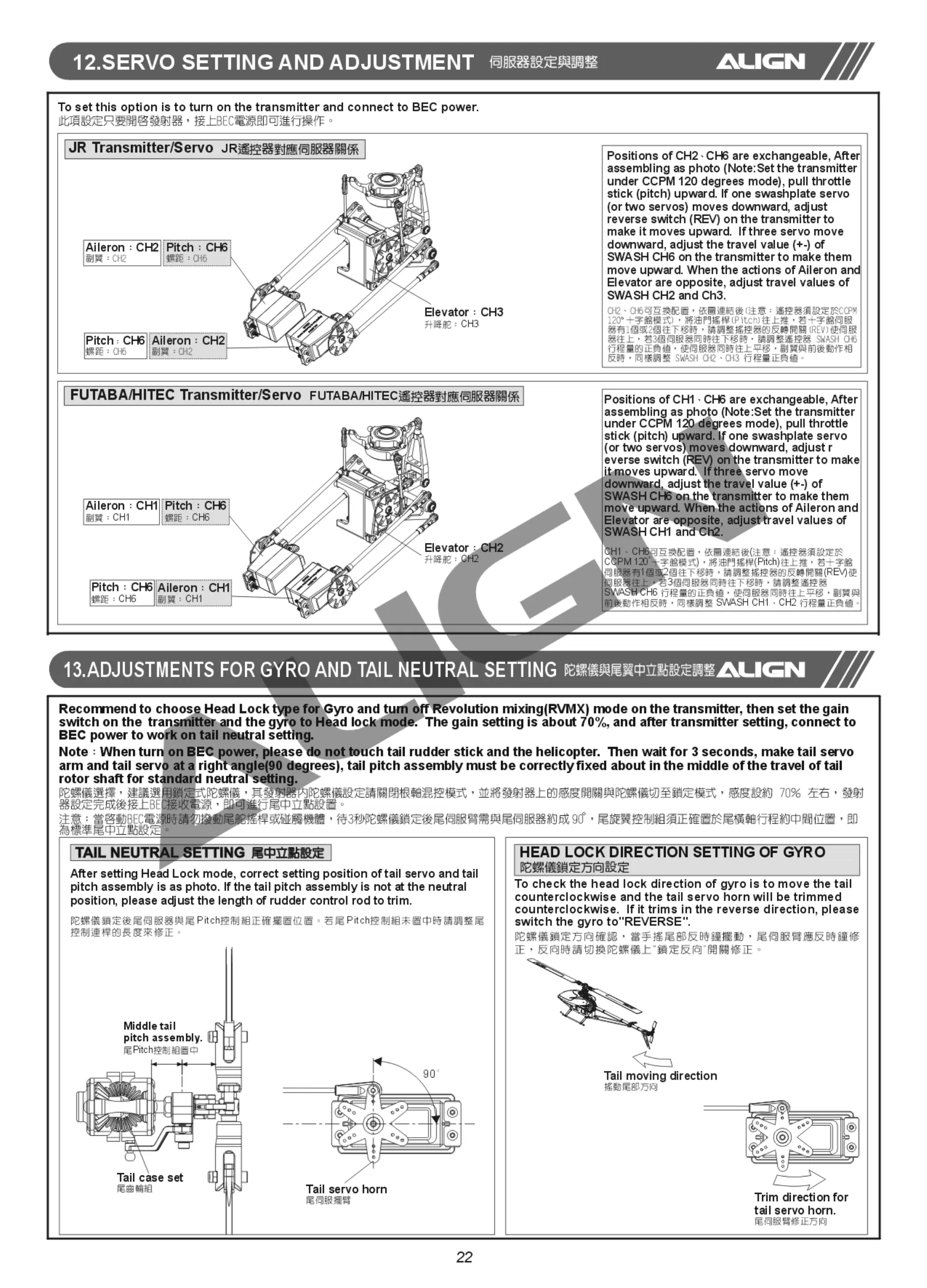 Align TREX 700E - Servo Setting and Adjustment; Adjustments for Gyro and Tail Neutral Setting; Gyro and Tail Neutral Point Setup; Head Lock Direction Setting