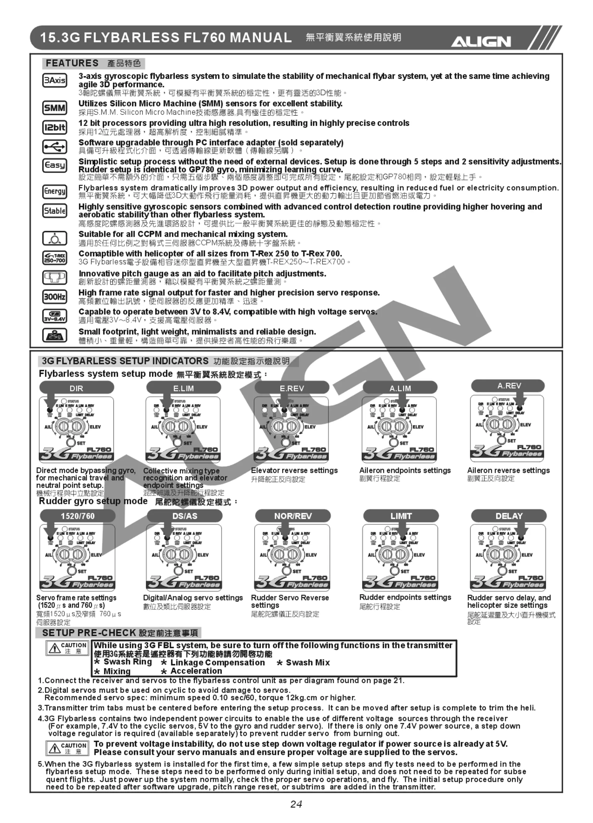 Align TREX 700E - 3 G Flybarless FL760 Manual; Features and Setup Indicators
