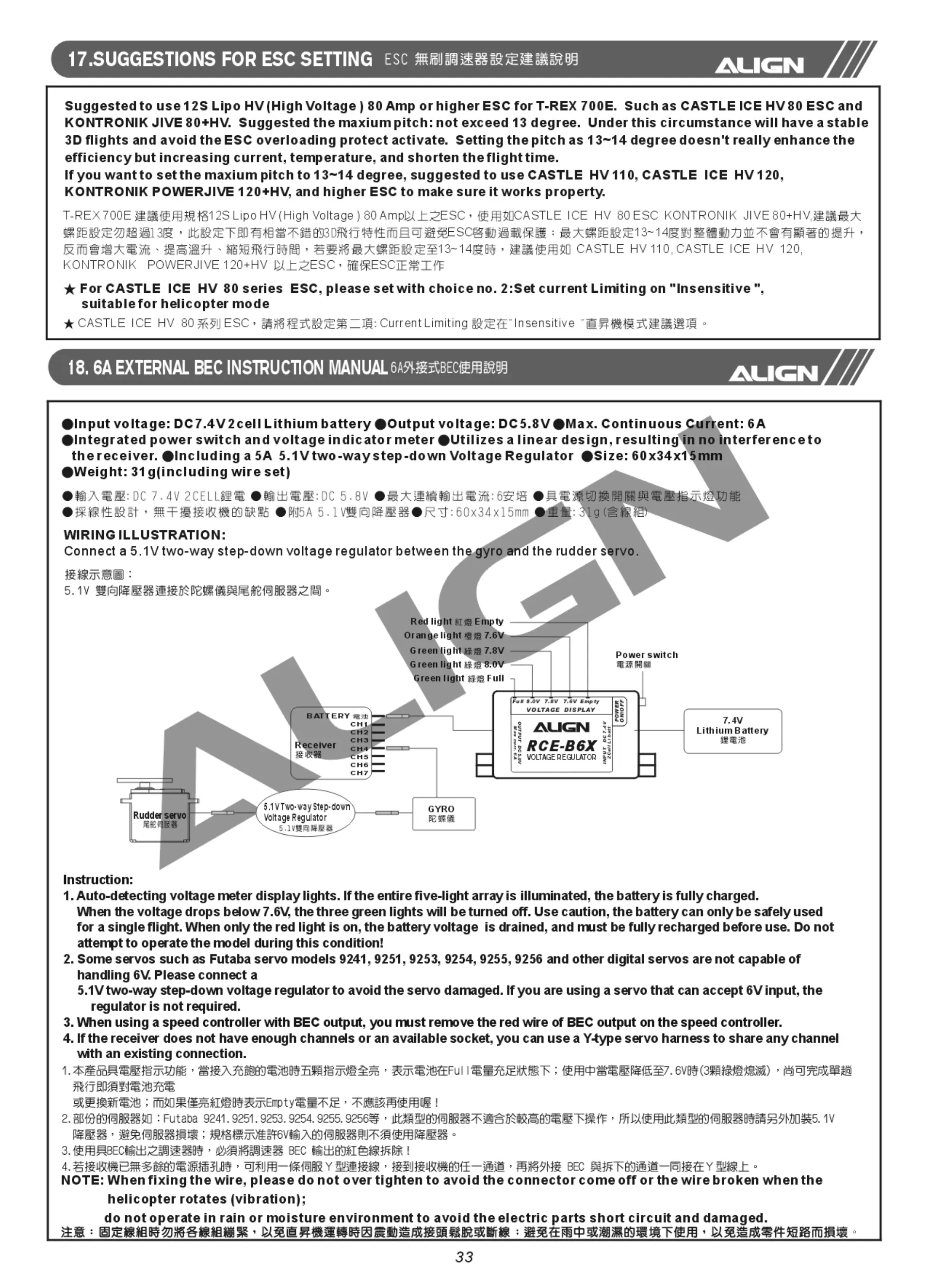 Align TREX 700E - Suggestions for ESC Setting; ESC Configuration Recommendations; 6 A External BEC Instruction Manual; BEC Unit Specifications and Wiring
