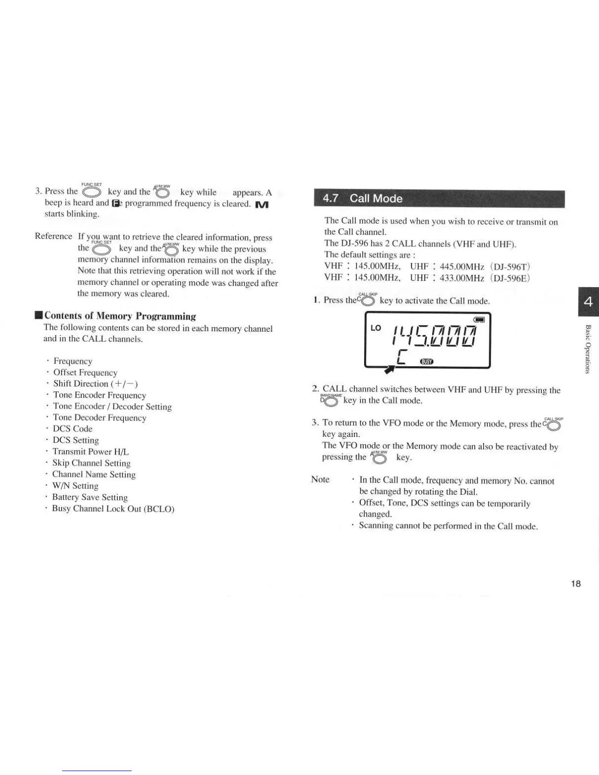 Alinco DJ-596T - Call Mode; Contents of Memory Programming