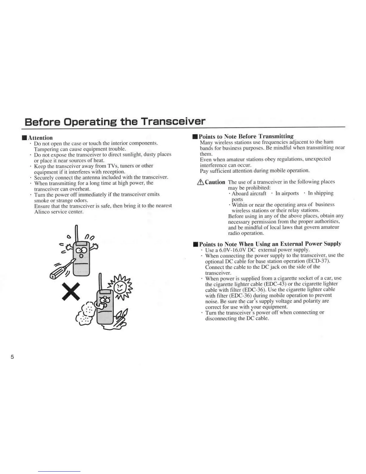 Alinco DJ-596T - Before Operating the Transceiver; Attention and Safety Precautions; Points to Note Before Transmitting; Using an External Power Supply