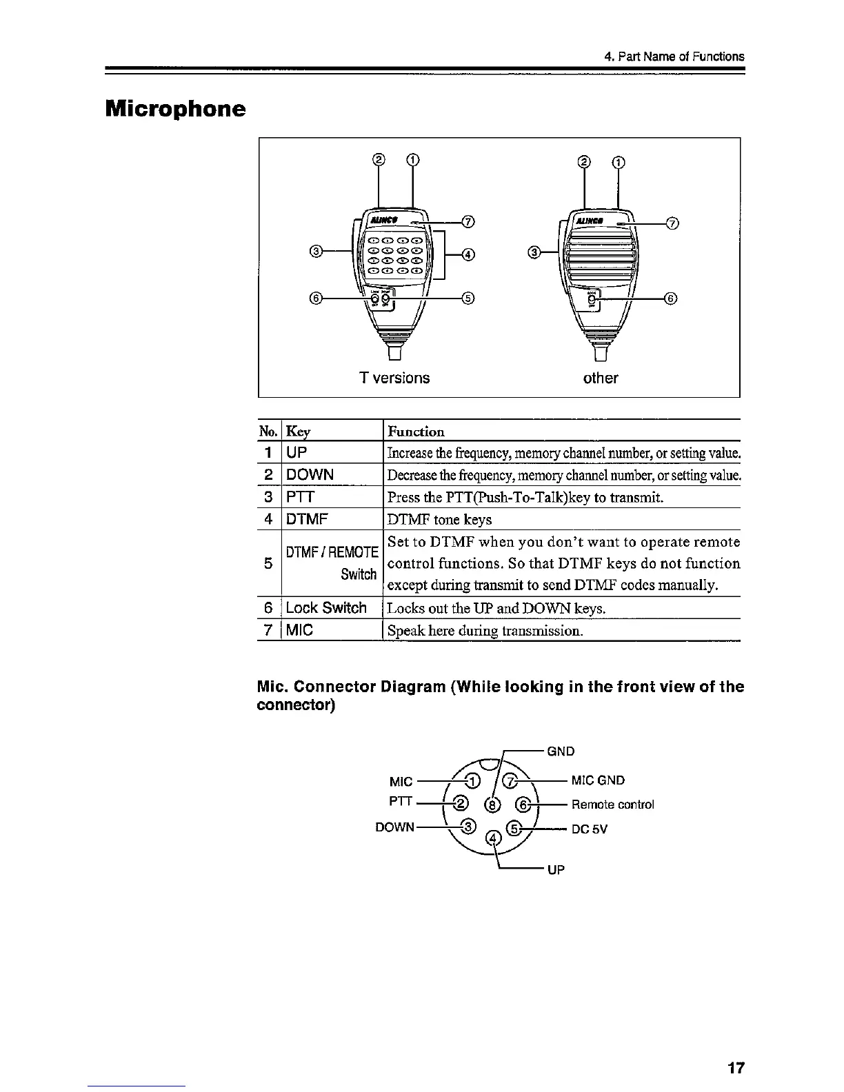 Alinco DR-03T - Microphone Features and Connections; Microphone Control Operations; Microphone Connector Pinout