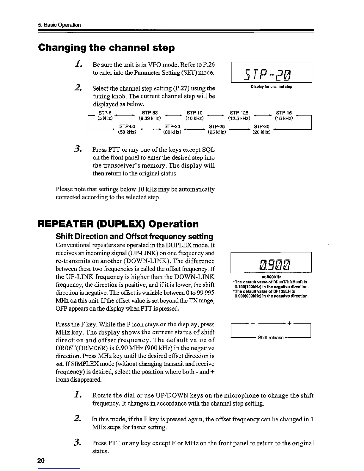 Alinco DR-03T - Basic Operations - Channel Steps and Repeaters; Configuring Channel Step Size; Repeater (Duplex) Operation Guide