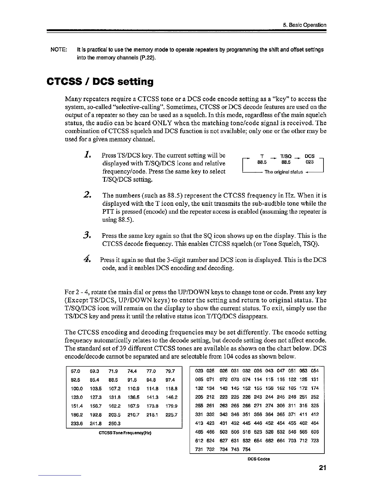 Alinco DR-03T - Basic Operations - CTCSS and DCS; CTCSS;DCS Tone and Squelch Setup; Available CTCSS Frequencies; Available DCS Codes
