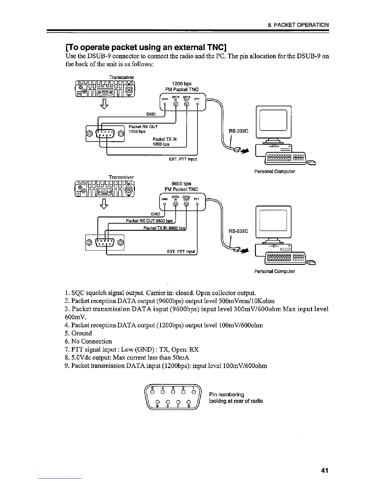 Alinco DR-03T - Packet Operation - External TNC and DSUB-9; Connecting an External TNC; DSUB-9 Connector Pinout Details