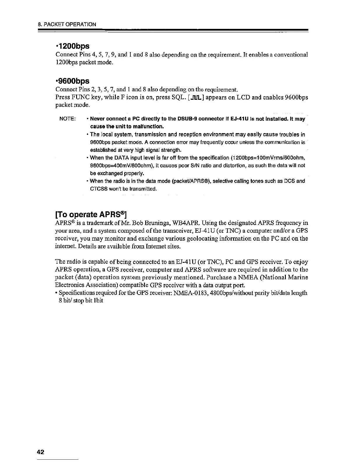 Alinco DR-03T - Packet Operation - Data Speeds and APRS; 1200 bps Packet Mode Configuration; 9600 bps Packet Mode Configuration; APRS Operation Basics