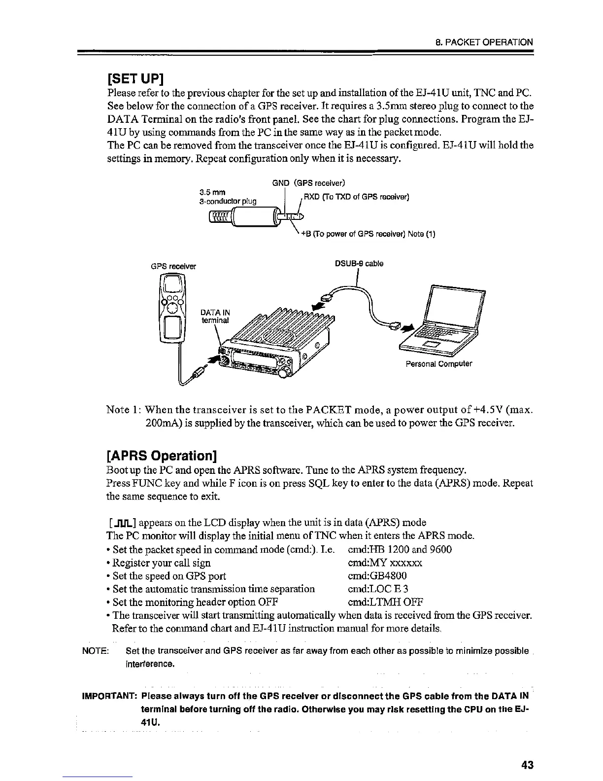 Alinco DR-03T - Packet Operation - APRS Setup and GPS; GPS Receiver Connection for APRS; APRS Mode Operation and Commands