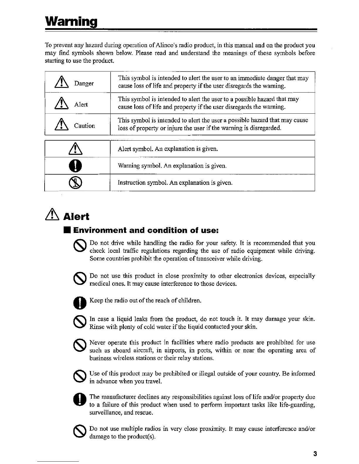 Alinco DR-03T - Important Safety Warnings; Understanding Warning Symbols; Safe Operating Environment Guidelines