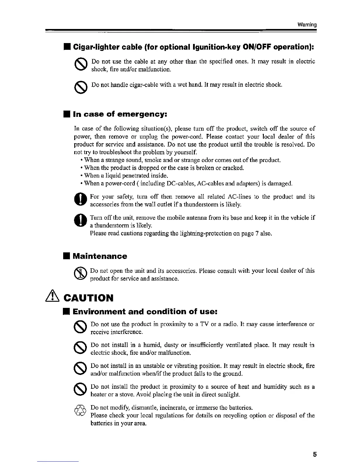 Alinco DR-03T - Emergency, Maintenance, and Cable Safety; Cigar-lighter Cable Precautions; Emergency Response Procedures; Maintenance Safety Guidelines