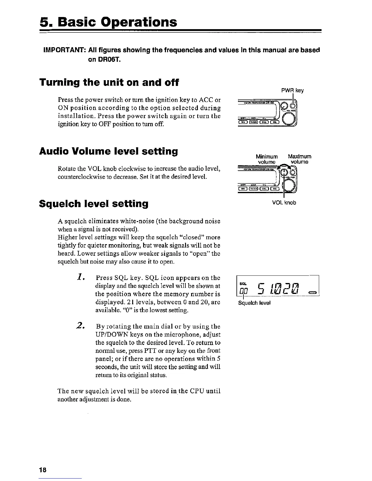 Alinco DR-06T - Basic Transceiver Operations; Powering On and Off; Adjusting Audio Volume; Setting the Squelch Level