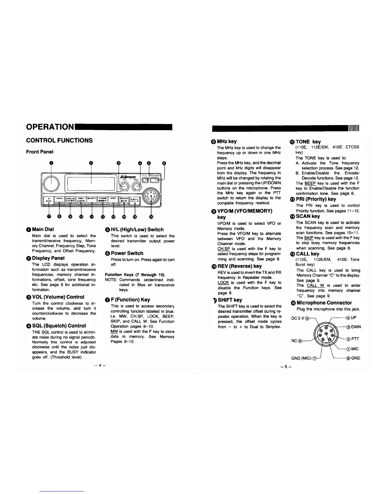 Alinco DR-110T - Operation and Controls; Front Panel Control Functions; Microphone Connector