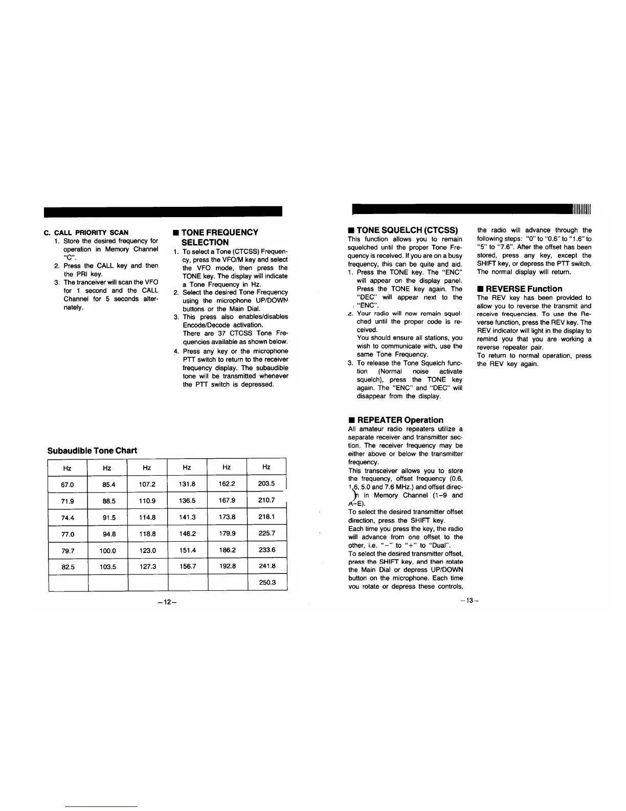 Alinco DR-110T - Tone Frequency Selection and Squelch; Tone Frequency Selection; Tone Squelch (CTCSS) Operation; Repeater and Reverse Operations