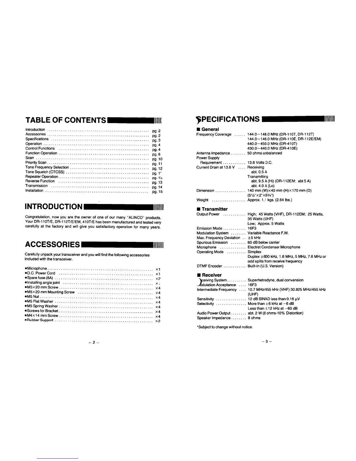 Alinco DR-112T - Table of Contents; Introduction; Accessories; Specifications