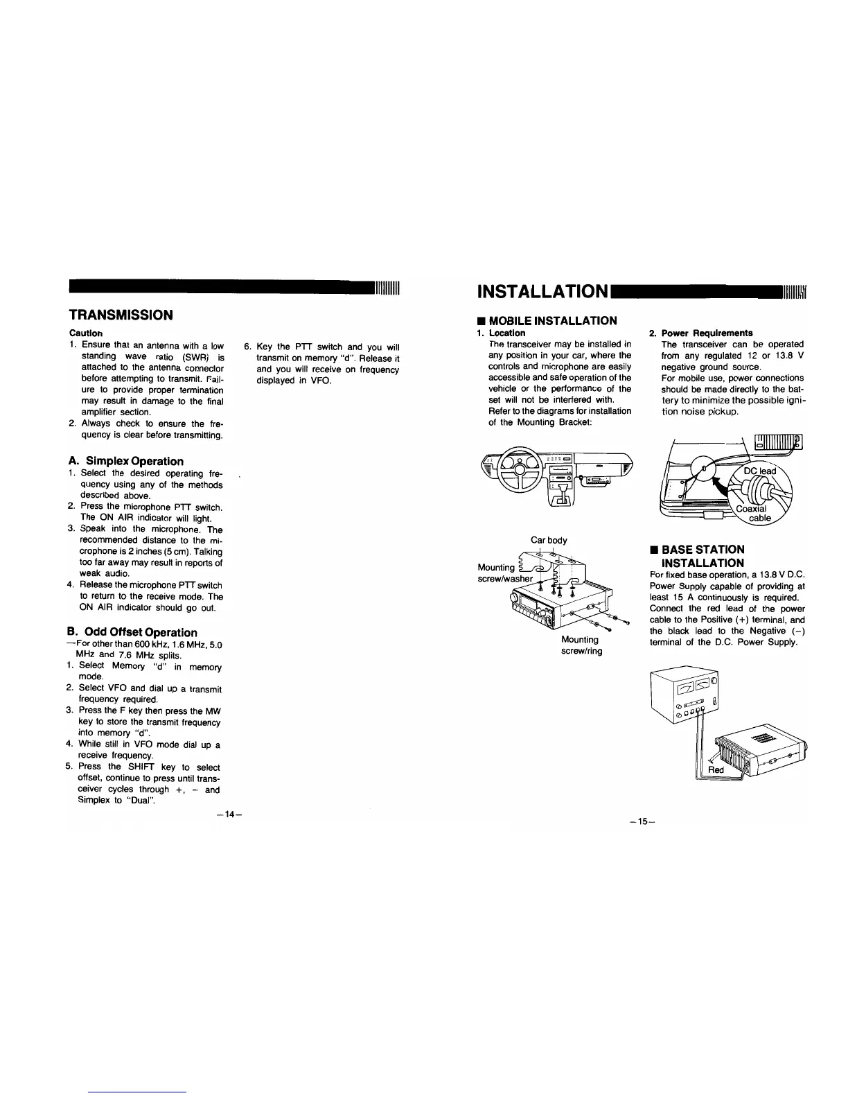 Alinco DR-119T - TRANSMISSION; INSTALLATION; Mobile Installation; Base Station Installation