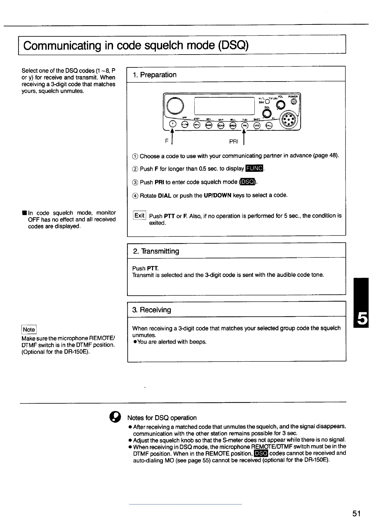 Alinco DR-150 - Code Squelch Communication (DSQ); Preparation for Code Squelch; Transmitting and Receiving in DSQ Mode