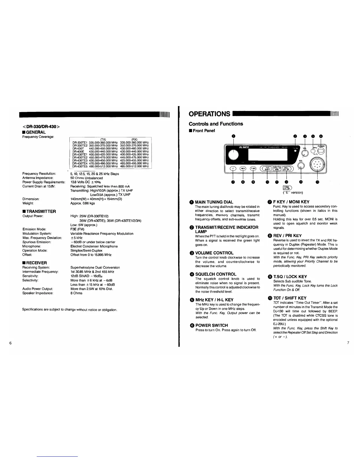 Alinco DR-430 - DR-130 Specifications; Operations; Front Panel Controls Overview
