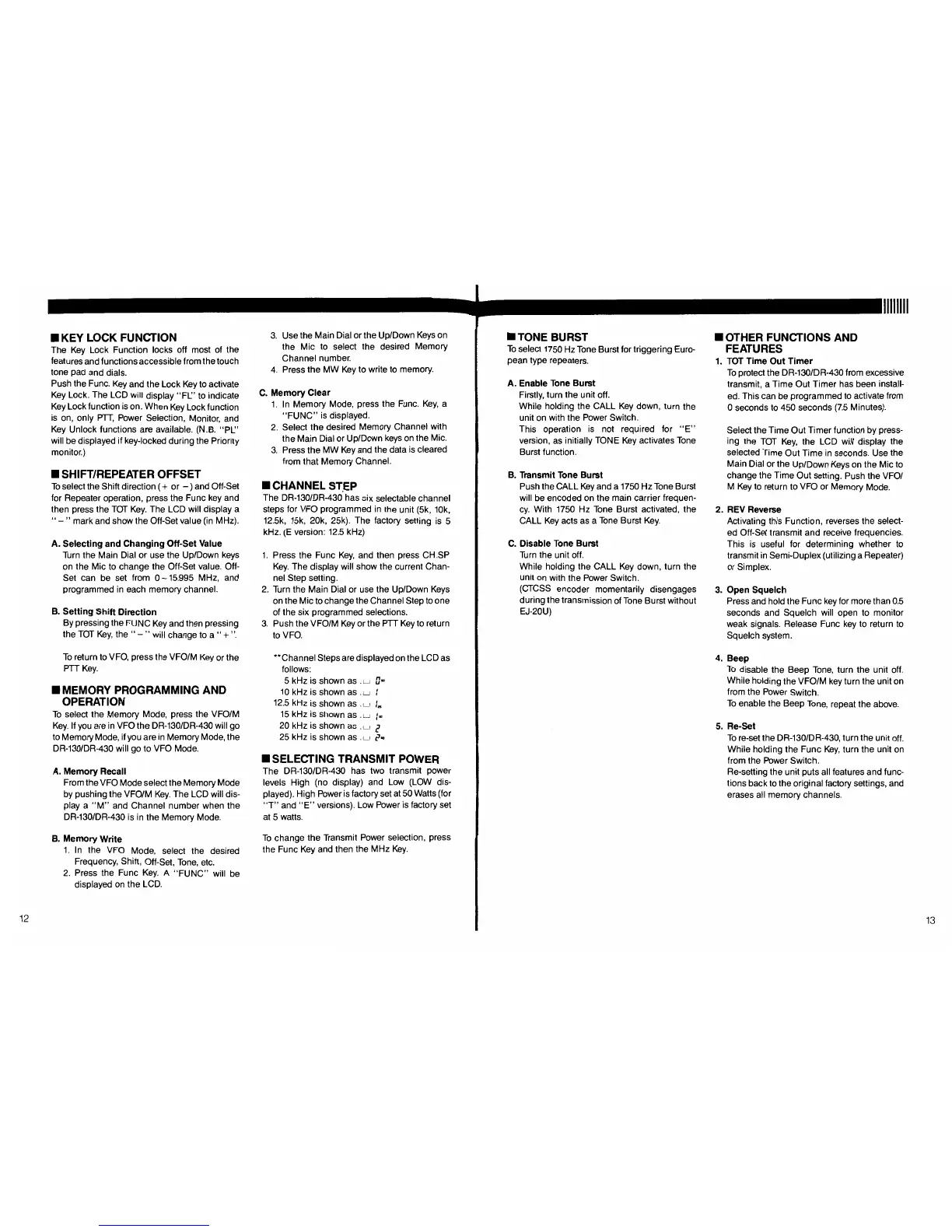 Alinco DR-430 - Key Lock Function; Memory Programming and Operation; Channel Step; Tone Burst