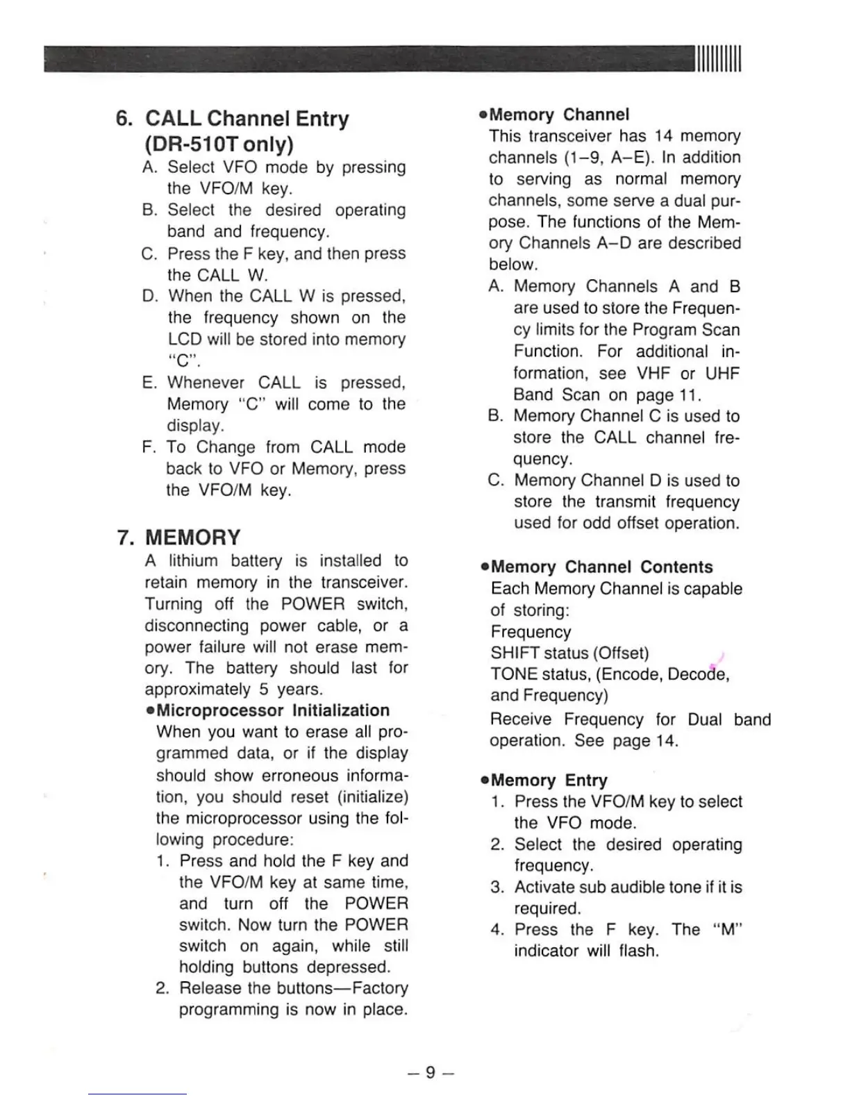Alinco DR-510E - CALL Channel Entry; Microprocessor Initialization; Memory Channel Management