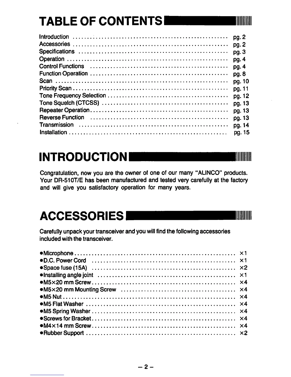 Alinco DR-510T - Table of Contents; Introduction; Accessories