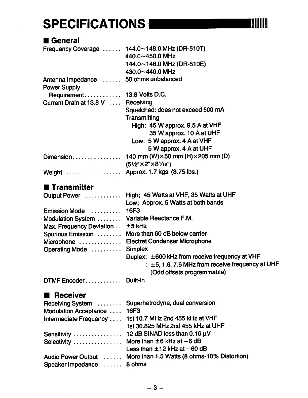 Alinco DR-510T - Specifications Overview; General Specifications; Transmitter Details