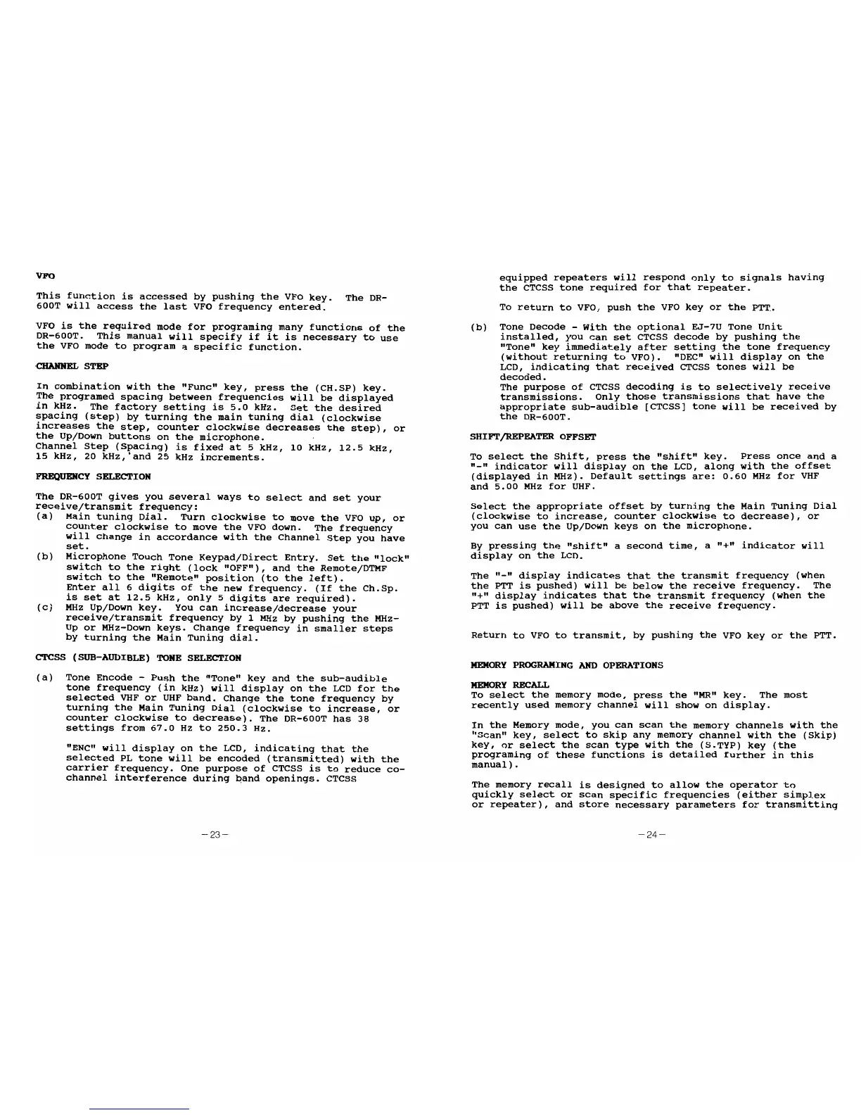 Alinco DR-600T - Core Transceiver Functions; VFO, Channel Step, and Frequency Selection; CTCSS Tones and Repeater Offsets