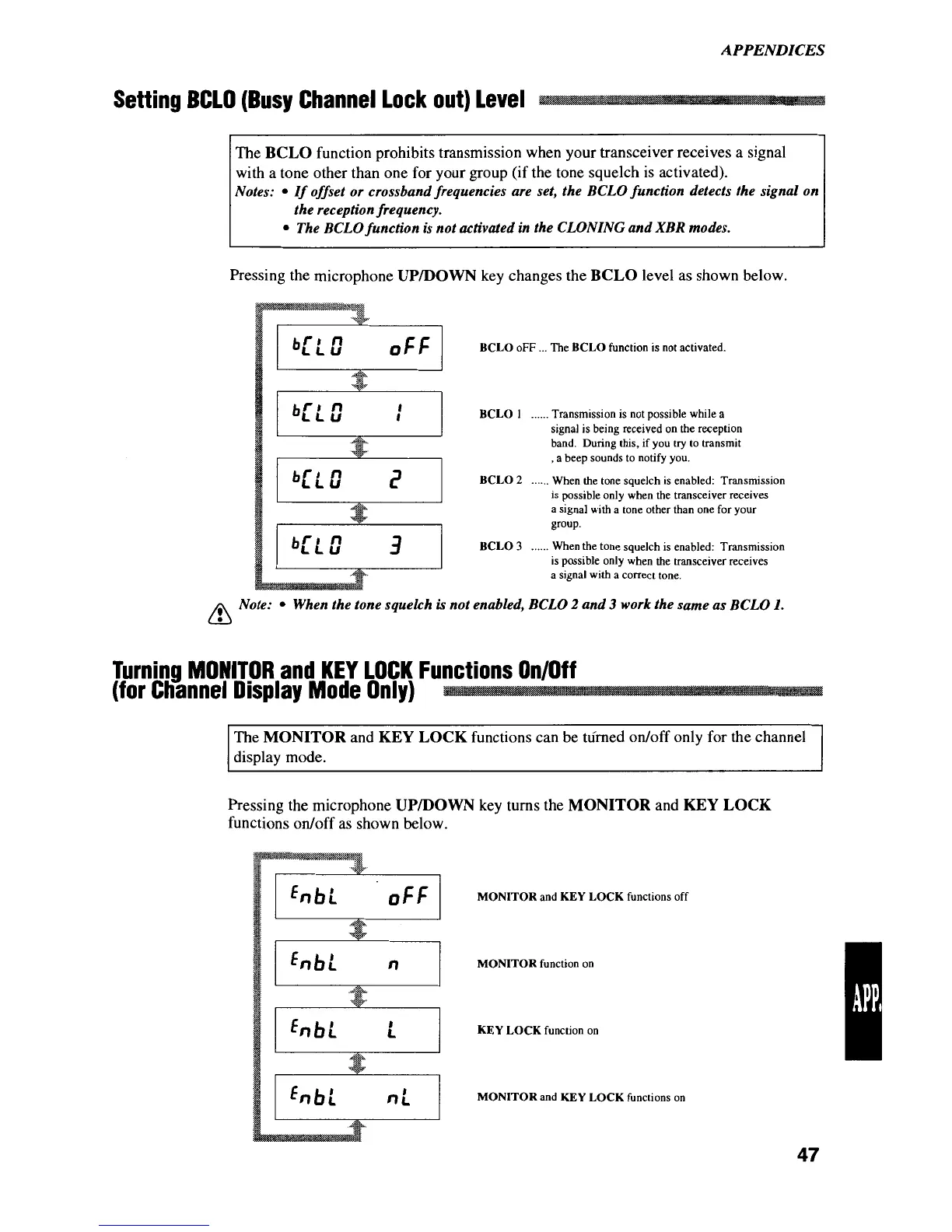 Alinco DR-605E - Setting BCLO (Busy Channel Lock out) Level; Turning MONITOR and KEY LOCK Functions On;Off