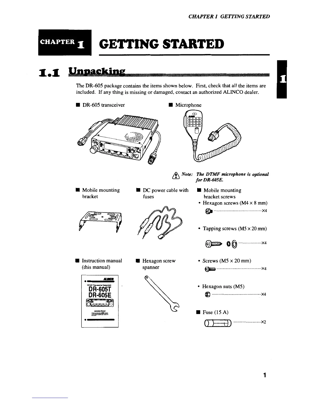 Alinco DR-605E - CHAPTER 1 GETTING STARTED; 1.1 Unpacking