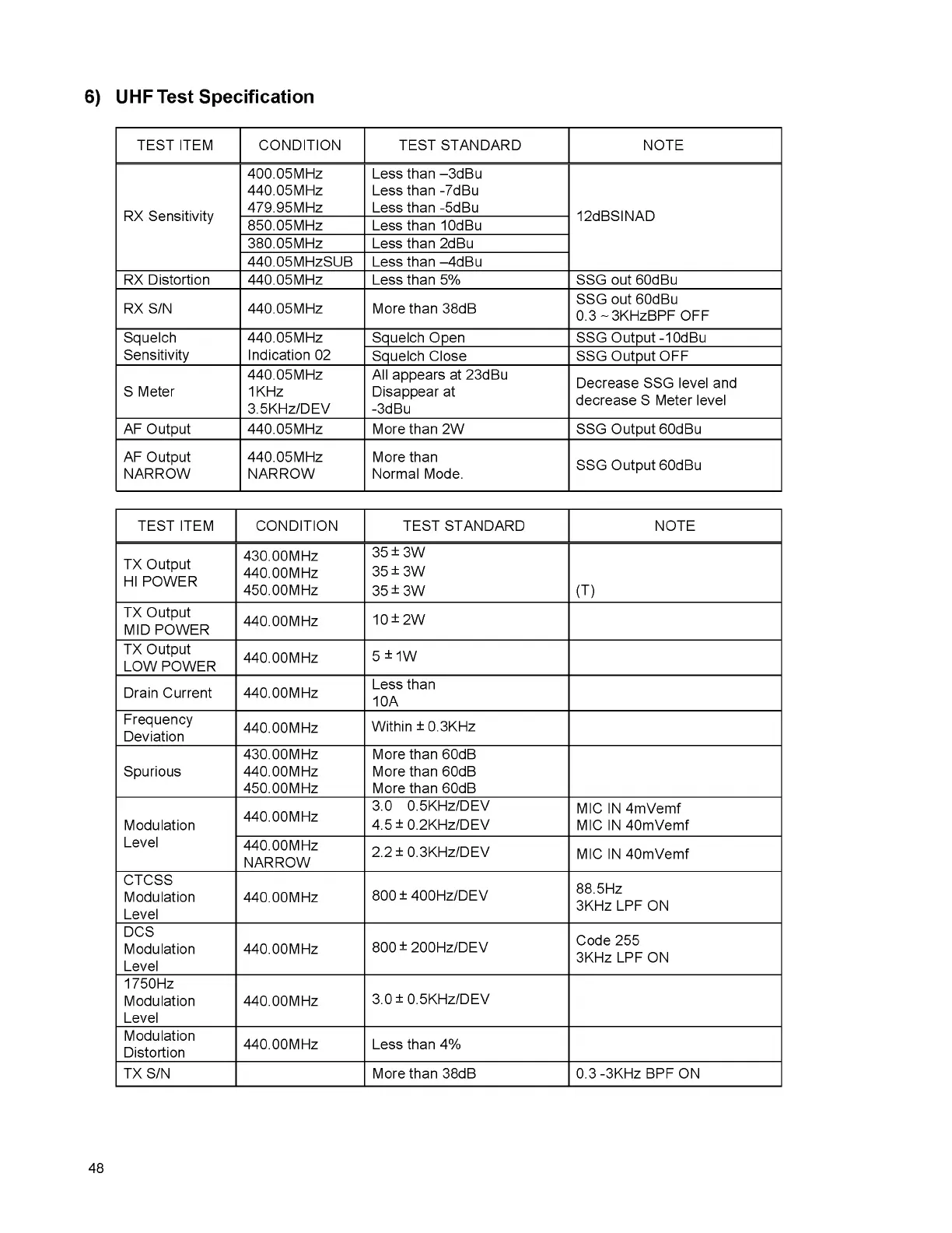RX Distortion 440.05M H z Less than 5% SSG out 60dBu