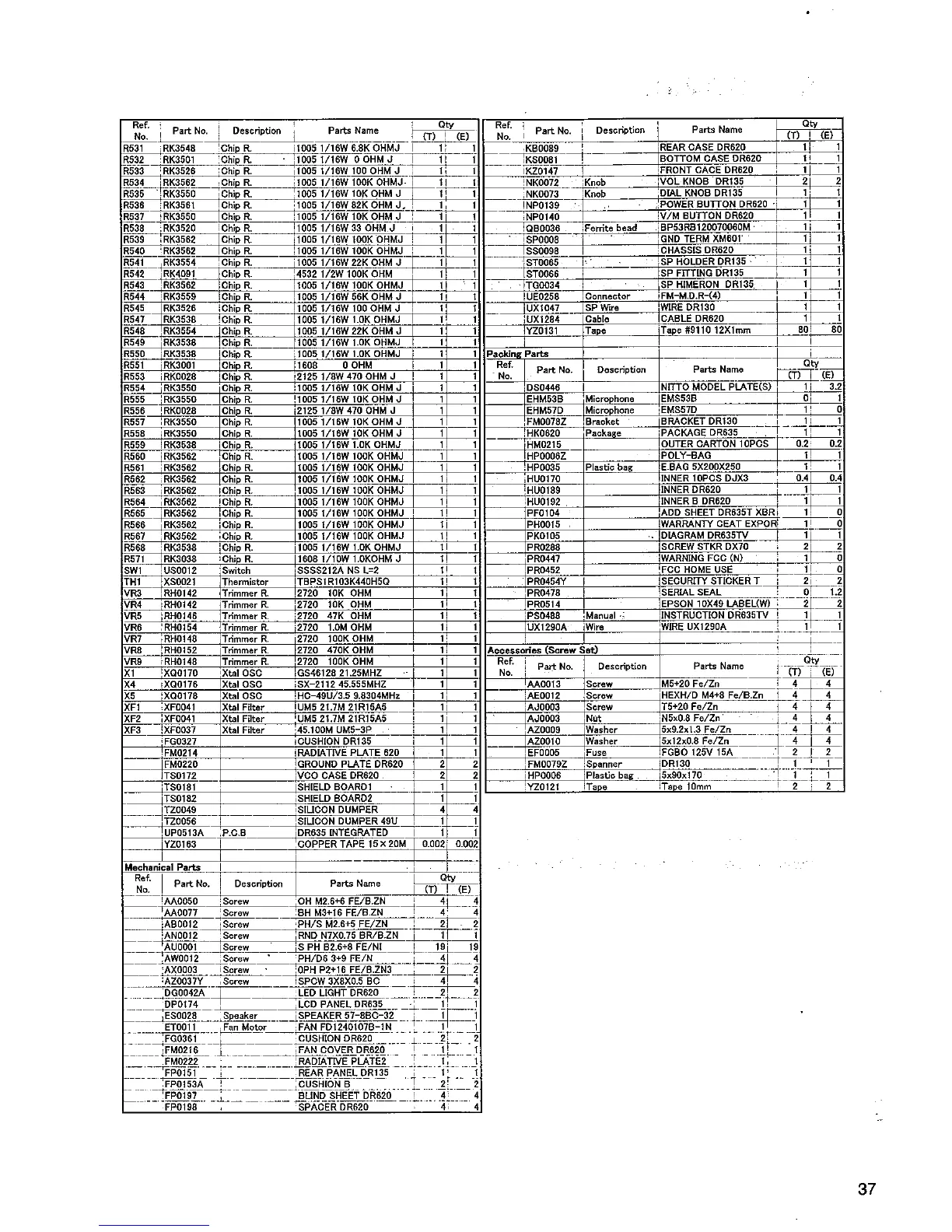 Alinco DR-635 - Mechanical Parts; Packing Parts; Accessories (Screw Set)