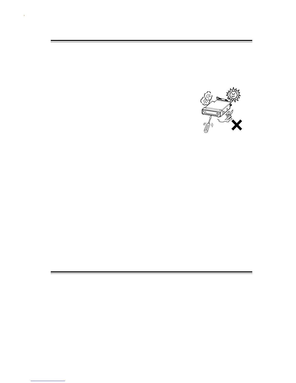 •Do not use or keep the transceiver where it is exposed to direct sunlight, dusty