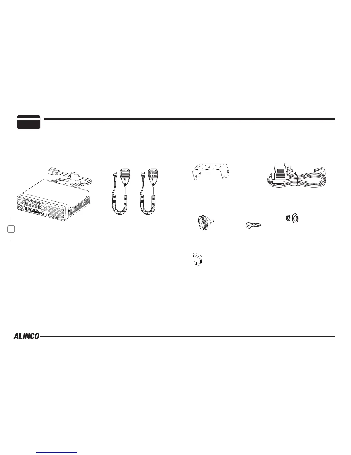 The standard accessories may vary slightly depending on the version you have purchased. Please contact your local authorized Alinco dealer should you have any